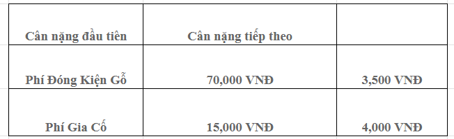 Phí đóng kiện gỗ,gia cố bao gồm phí gia công và vật dụng sử dụng để đóng kiện, được nhatbien quy đổi phí theo cân nặng tính tiền của kiện sau khi gia cố như sau: