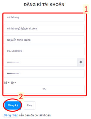 Bước 2: Nhập các thông tin đăng ký cần thiết, bao gồm các thông tin cần thiết: Email, Tài khoản, Họ tên, Số điện thoại, Mật khẩu