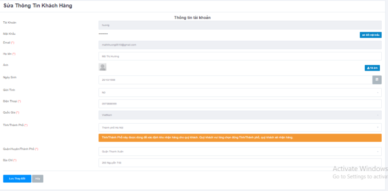 Bước 3: Nhập các thông tin tài khoản thay đổi : Ảnh đại diện, Mật khẩu, Tên đầy đủ, Ngày sinh, Giới tính, Quốc gia, Tỉnh/ Thành phố, Quận/ Huyện , Địa chỉ.